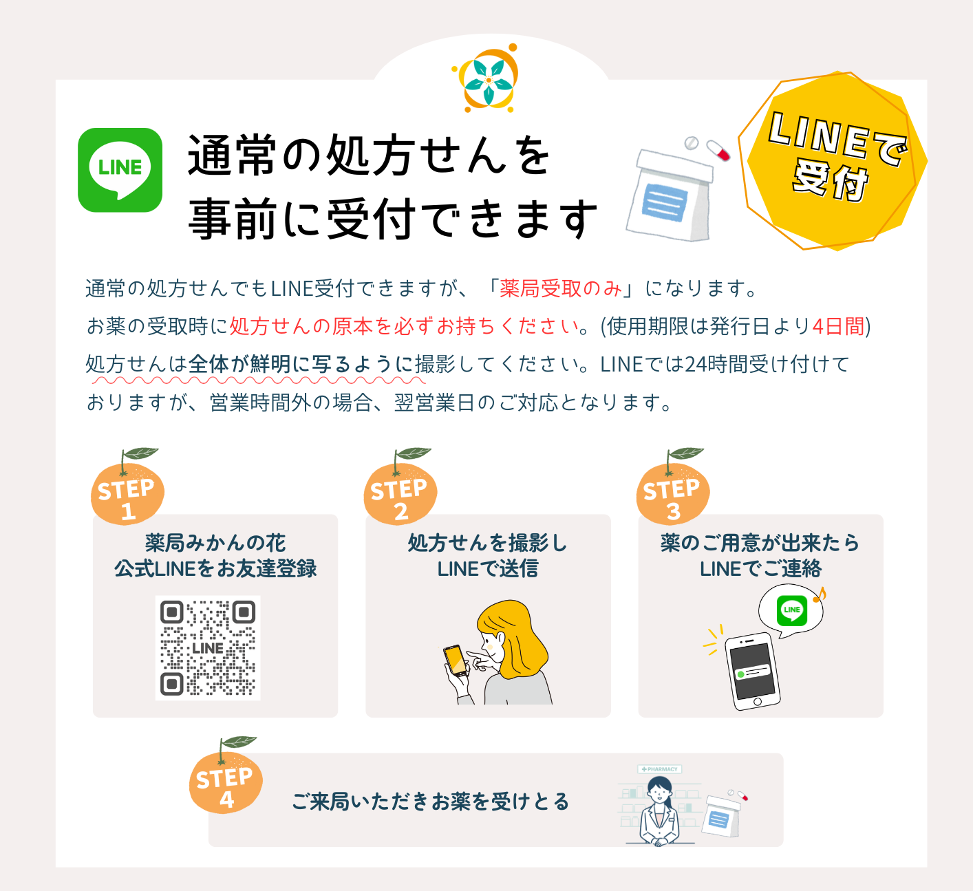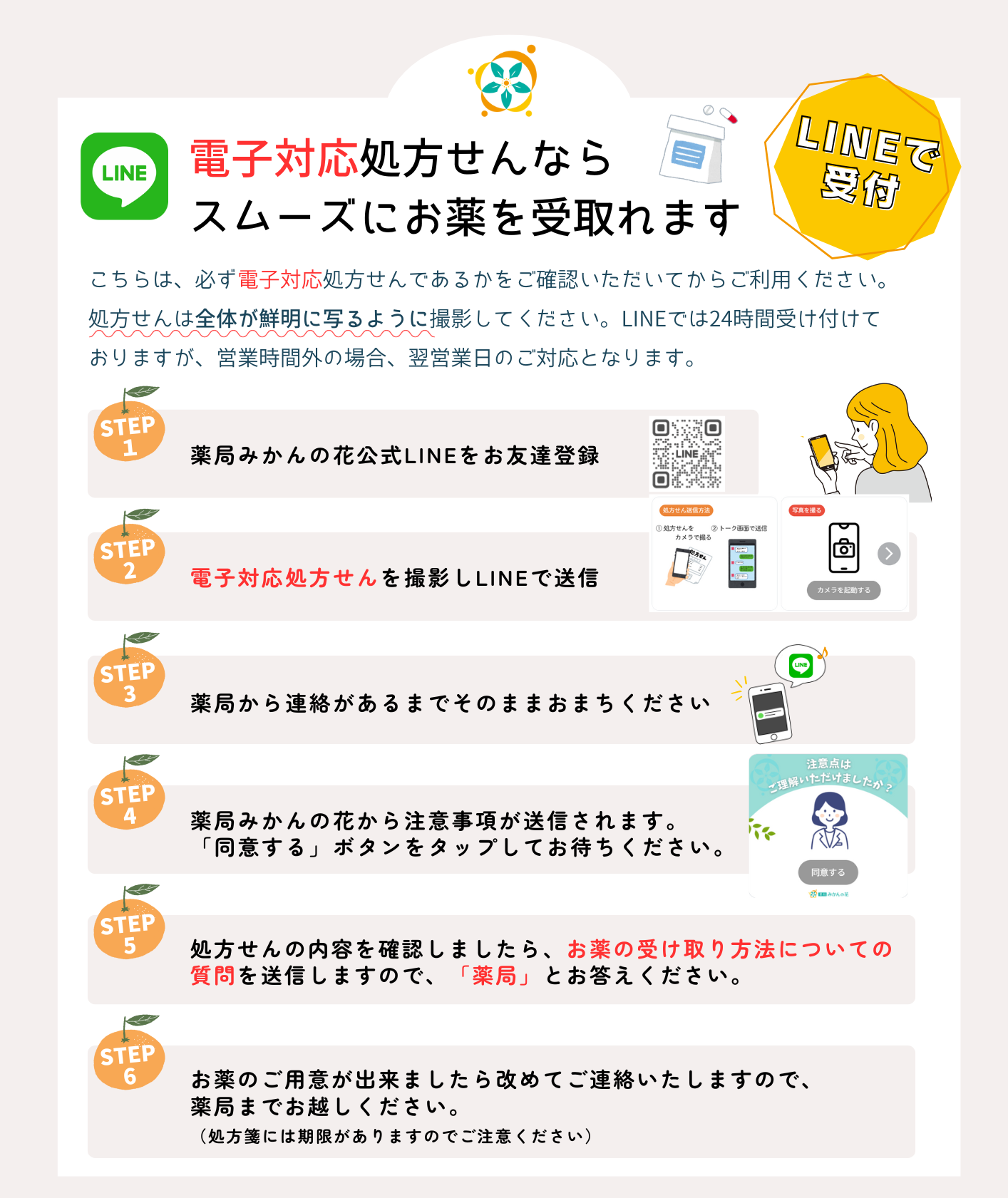 毎日お忙しい皆様にも、当薬局を利用していただきやすいよう、当店公式LINEでの処方せんの受付をしています。どの医療機関の処方箋にも対応しますので、仕事帰りやお休みの日など都合の良い時に受け取りができます。また、電子対応の処方せんをお持ちの方は、ご自宅でお薬の受け取りができるようになりました。